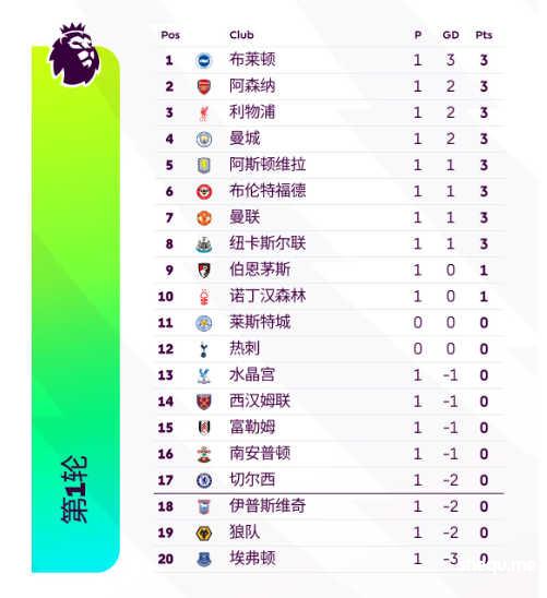 英超首轮只剩热刺、莱斯特未踢,布莱顿暂领跑,曼城、利物浦、阿森纳、曼联均开门红。