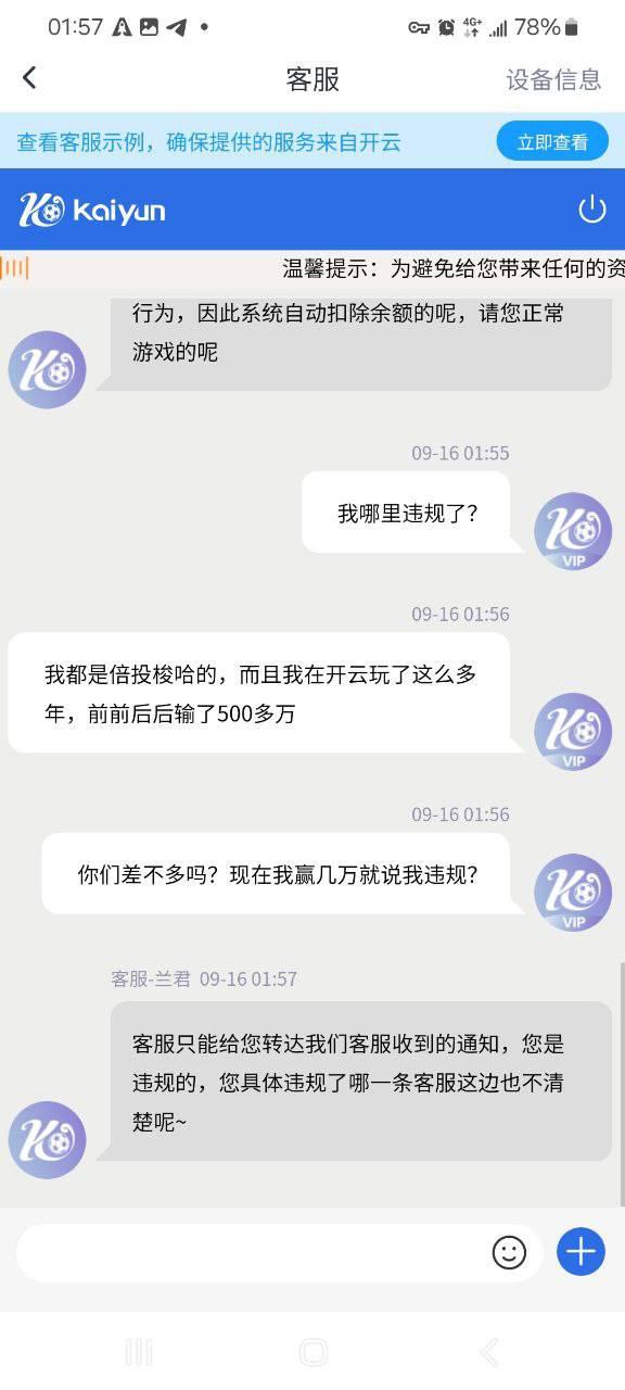 直接给我锁定,我再去找客服问是什么情况,客服说我投注违规,直接给我连本带利全部扣完了,我的玩法都是倍投的怎么可能违规,系的像你们这样杀人的。我的开云账号我也发出来了,23年的时候还是v9,有一段时间没玩了,现在也是v6,但是输的500万是实实在在的,这个开云你们心里清楚,但是狗日的开云好不容易赢个8万也他妈的黑,关键黑就算了他妈的本金也黑了,哪个博