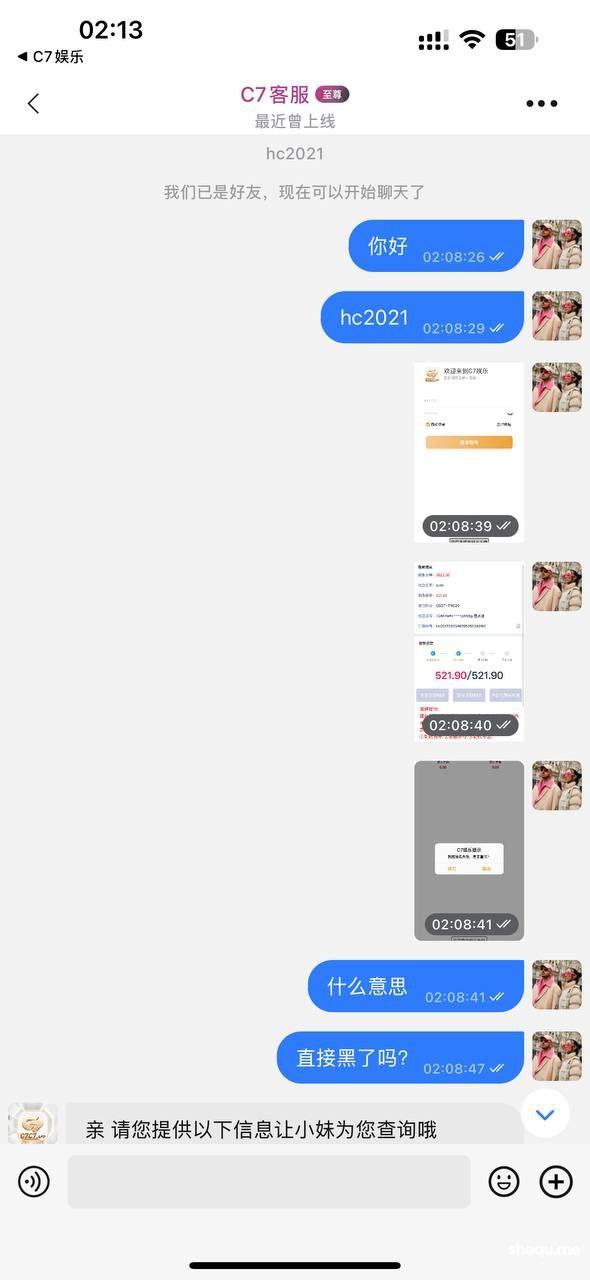C7娱乐 今天运气好 打体育赢了三千多 直接给黑了 我本金1500在里面 提款3600 等了一个多小时 没到账 我上账号一看 密码直接被改了